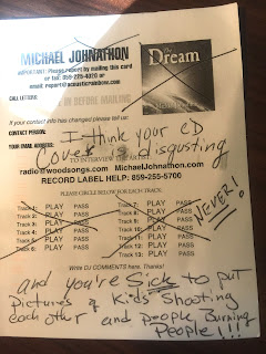 Above is a response card we got from a radio DJ. This person saw the cover and made a judgement about the album and about me without even listening to the song. I love our community of radio friends but please notice this coward didn't even sign their name. MY name is on my album. It is MY statement, I am proud of it and I stand by it openly. This wanker is hiding behind anonymity like a fearful hatemonger.